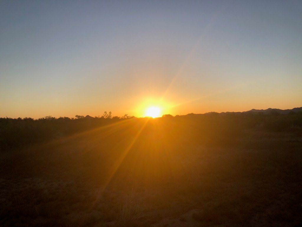 I’m enjoying the 40-75 yard distance between my closest neighbor and me. Simultaneously, the occasional dessert rodent scurries pass from cacti to brush, avoiding air attacks from circling Hawks above.