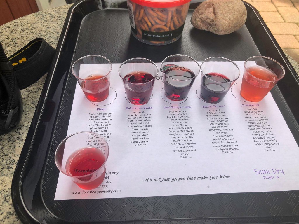 My one night Harvest Host reservation at Forestedge Winery in Laporte MN began around 2:00 pm. Several groups of people were seated at tables social distancing with many wearing their masks. The owners, Steve and Kristin Twait, and their daughter wore their masks and socially distanced from their customers. The patio is open for tastings and glasses of wine with curbside service.